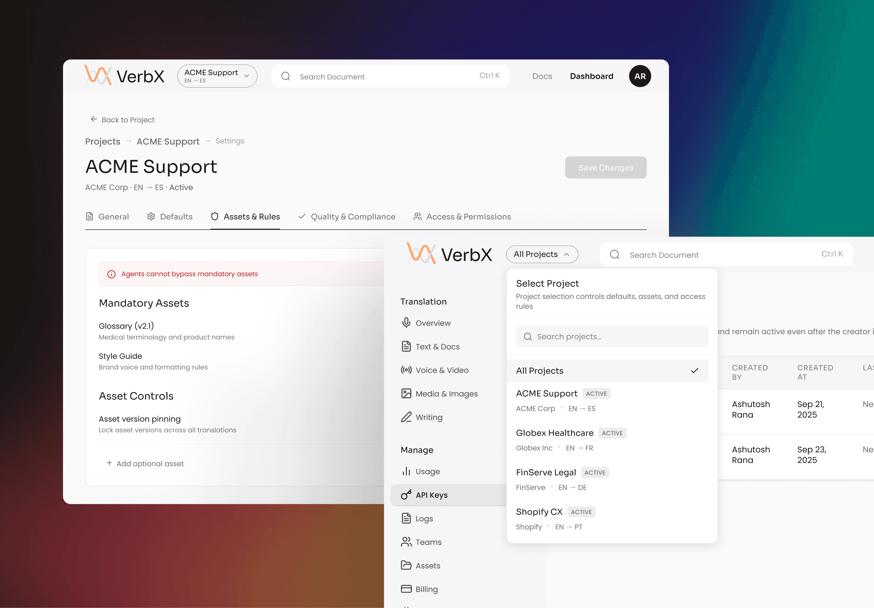 A SaaS platform for real-time, multi-modal translation built for regulated environments. The system prioritizes project-scoped control, enforceable assets, and clear interaction models to ensure consistent behavior across text, voice, media, and APIs reducing ambiguity while maintaining compliance, scalability, and operational trust.